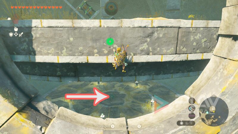Weiter geht es beim Wassertempel. Ihr solltet bereits den Eingang des Wassertempels freigeschaltet haben, dann könnt ihr von hier aus zum gesuchten Punkt unter dem Wassertempel gleiten.