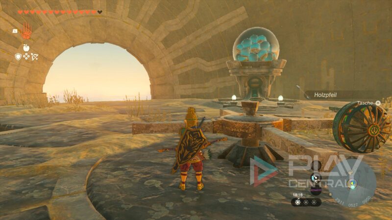 Wo ist jetzt die Truhe mit dem Segen? Die Truhe befindet sich tatsächlich in der Kugel. Also wie kommen wir hier hinein? Auf der mittleren Plattform befindet sich ein Katapult. Das schleudert euch in die Luft neben die Kugel. Von hier aus seht ihr das Loch und den Eingang zur Kugel.