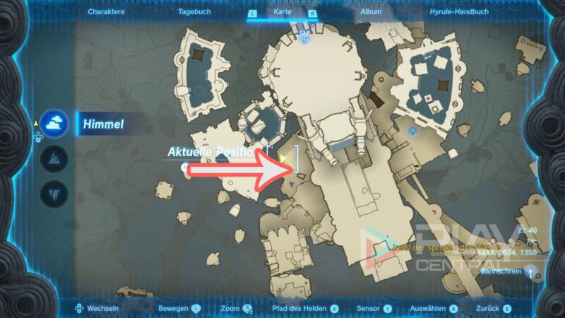 Die Truhe befindet sich innerhalb der unteren Insel. Fliegt sie von der Luft aus direkt an. Wenn ihr oben gelandet seid, müsst ihr allerdings noch eine Etage tiefer. Springt auf der Südseite ab und gleitet direkt eine Etage tiefer. Die Truhe ist im Südwesten der Insel, sehr mittig gelegen.