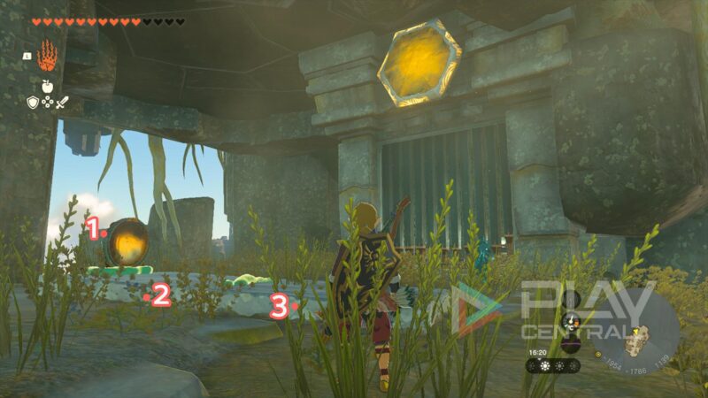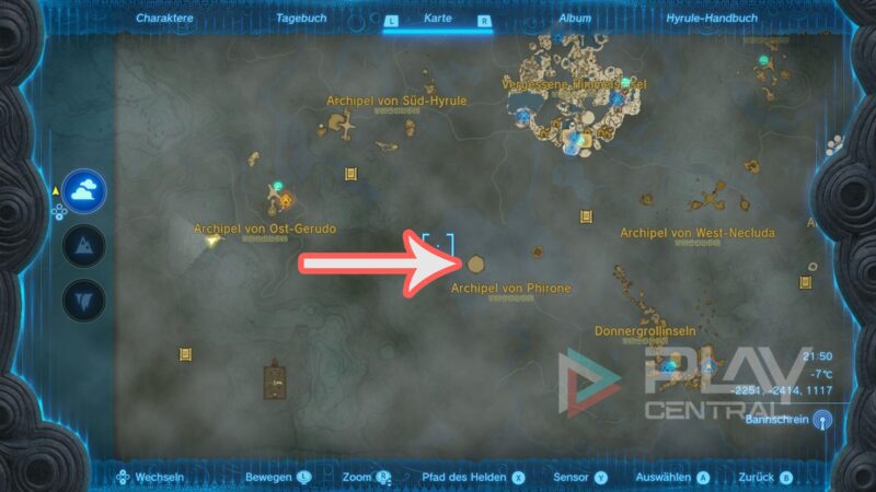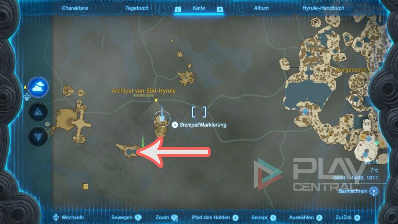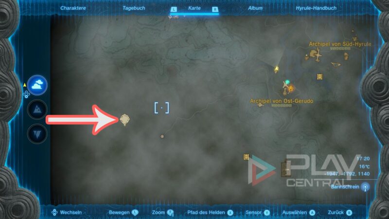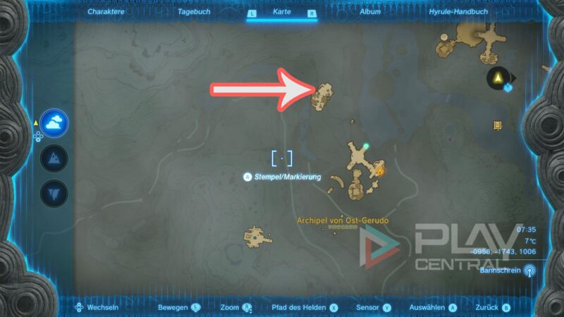 Für dieses Item starten wir im Südwesten der Karte, beim Turm im Gerudo-Tal. Wir müssen ins Archipel von Ost-Gerudo und näher gesagt an die nördliche Stelle auf unserer Karte.