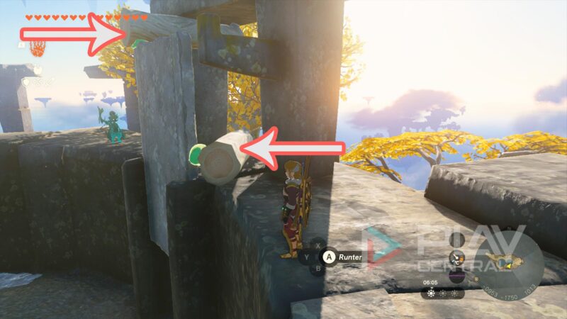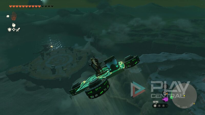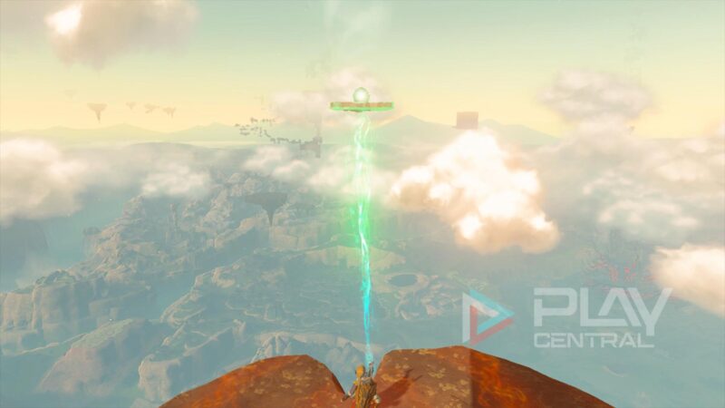 Hier laufen wir ganz nach oben an die südlichste Spitze und springen mit dem Gleiter ab. Fliegt dann in Richtung Südwesten. Das Ziel ist eine kreisrunde Steininsel. Mit 2x Ausdauerbalken könnt ihr das Ziel locker erreichen.