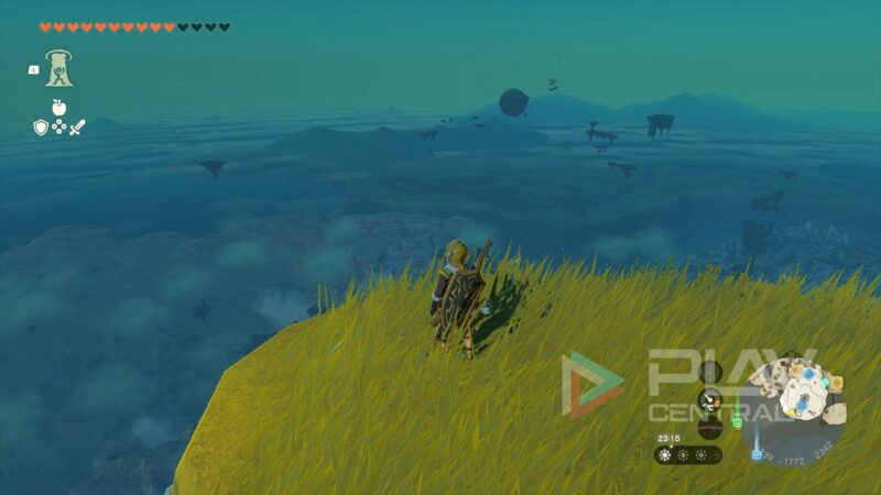 Diesen Hotspot erreichen wir über den Turm in der Ebene von Hyrule, relativ mittig auf der Weltkarte. In der Luft gleiten wir seelenruhig gen Süden zu dem markierten Punkt auf der Karte. Allerdings können wir nicht durchfliegen, da die Höhe nicht hinkommt.
