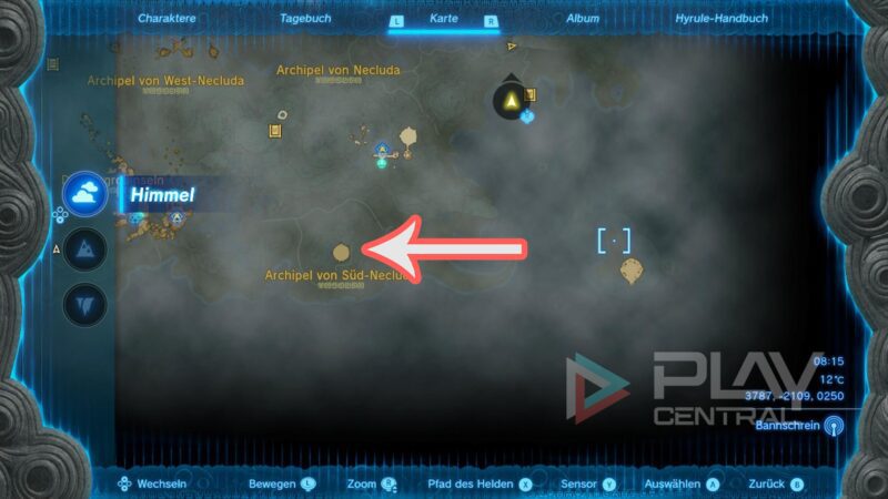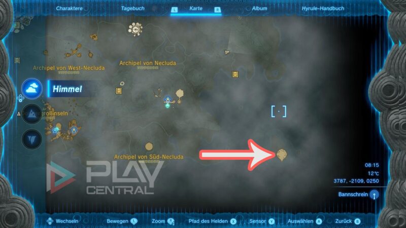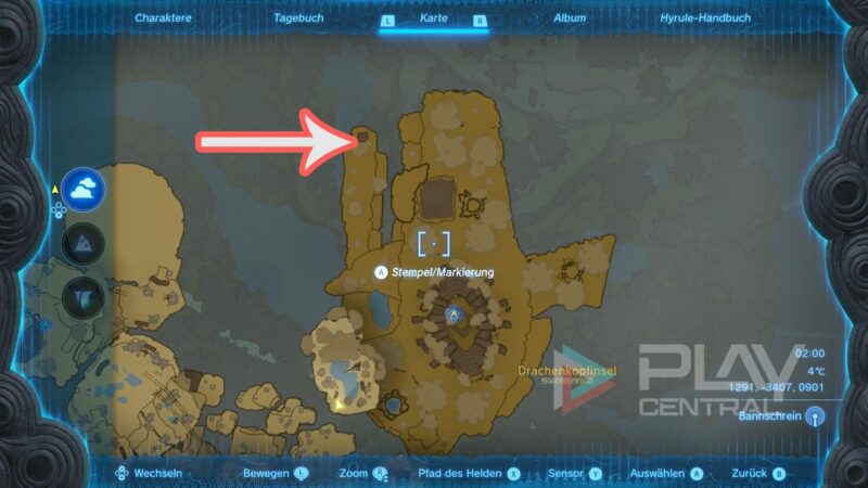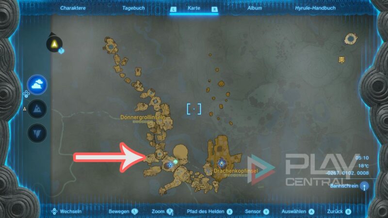 Auf den Donnergrollinseln gibt es noch eine weitere Truhe mit einem Segen, allerdings ganz im Osten beim Kopf, der sogenannten Drachenkopfinsel. Folgt dem Punkt bis zur markierten Stelle auf unserer Karte.