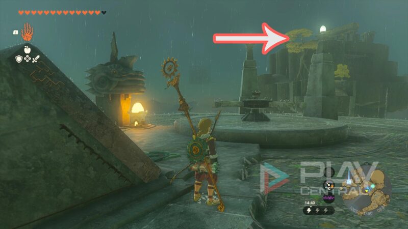 Arbeitet euch dann bis zum Djok-usini-Schrein vor und vollzieht einen Deckensprung, um oben auf der Insel heraus zu kommen. Lauft dann gen Westen zum nachfolgenden Punkt auf der Karte. Und Vorsicht vor den Blitzen!