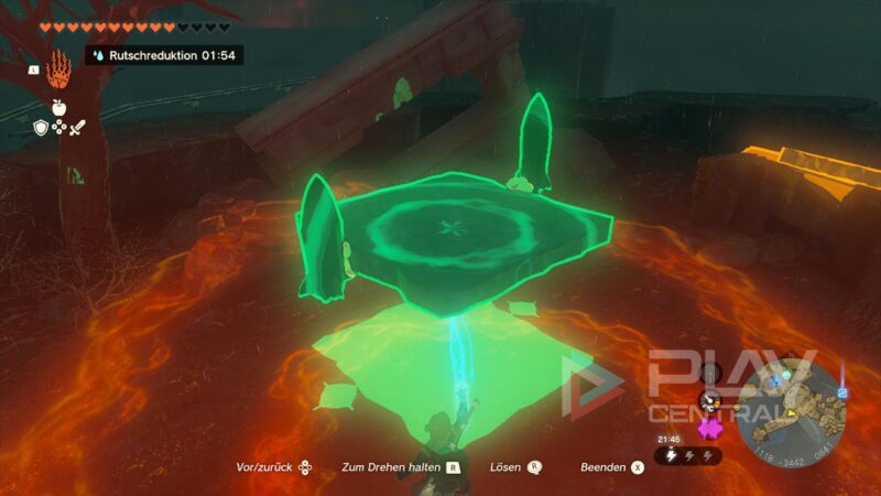 Der Lösungsweg: Begebt euch wieder zum Katapult in der Mitte der Karte. Nur dieses Mal lasst ihr euch gen Südosten abschießen, um dem Weg regulär zu folgen. Macht hier direkt einen Abbieger nach rechts. Hier oben liegen zwei Raketen, die ihr mit einer Steinplatte verbinden könnt.
