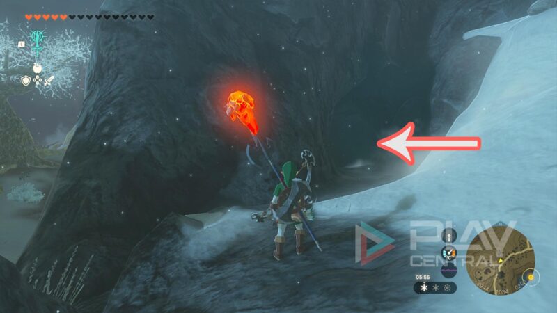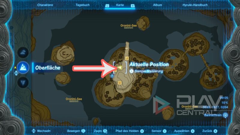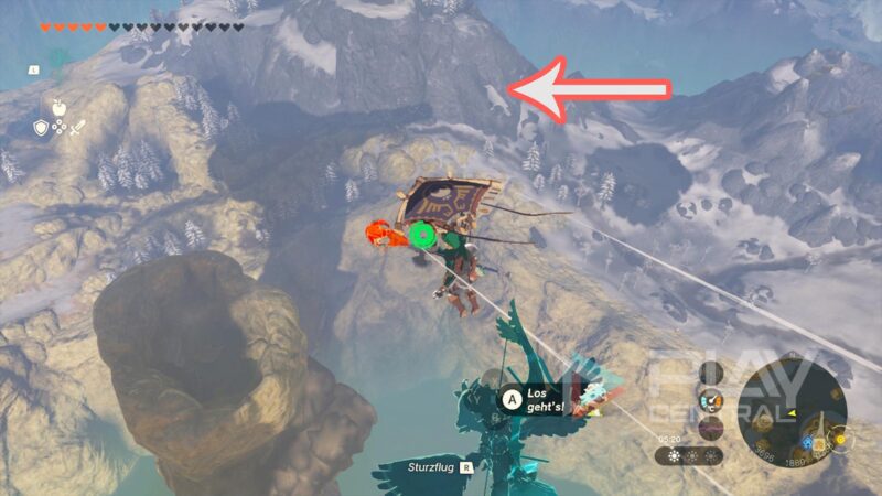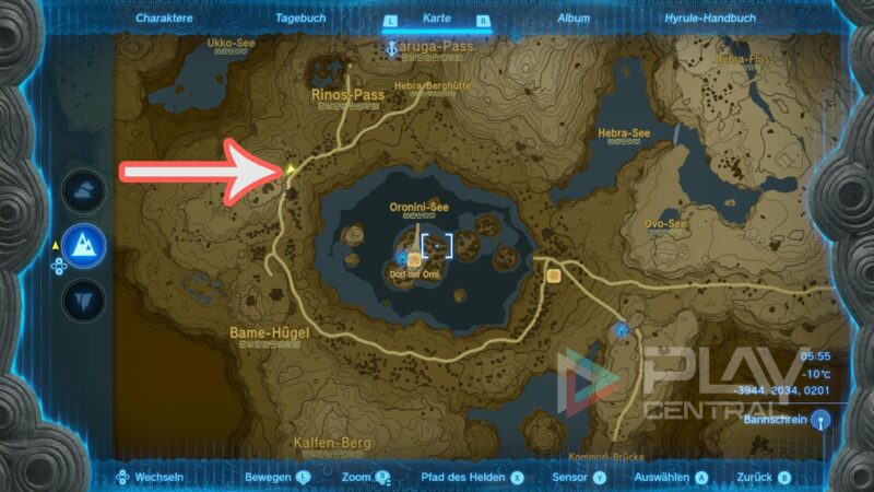 Markiert diese Stelle auf eurer Karte und gleitet nun zu diesem Ort. Fliegt am besten direkt zum Schnabel des Vogels, denn die Höhle am West-Oronini-See geht direkt vom Weißen Vogel aus in den Berg über.
