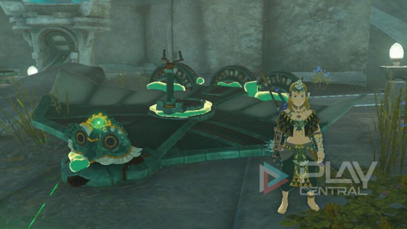 Doch es geht nicht mit Link allein zum besagten Ort. Du musst das Sonau-Relikt mitnehmen! Also tragen wir es zunächst nach draußen. Auf der rechten Seite sehen wir ein paar Sonau-Bauteile. Genug, um daraus ein Flugzeug zu bauen (siehe Bild).