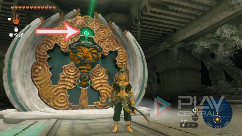 Aktiviert den Schaltert und der Arm fährt herunter. Nun sehen wir links eine Tür mit einem Rad. Mit einem Schlag aufs Rad öffnet es sich tatsächlich und wir können den Arm in den nächsten Raum bringen.