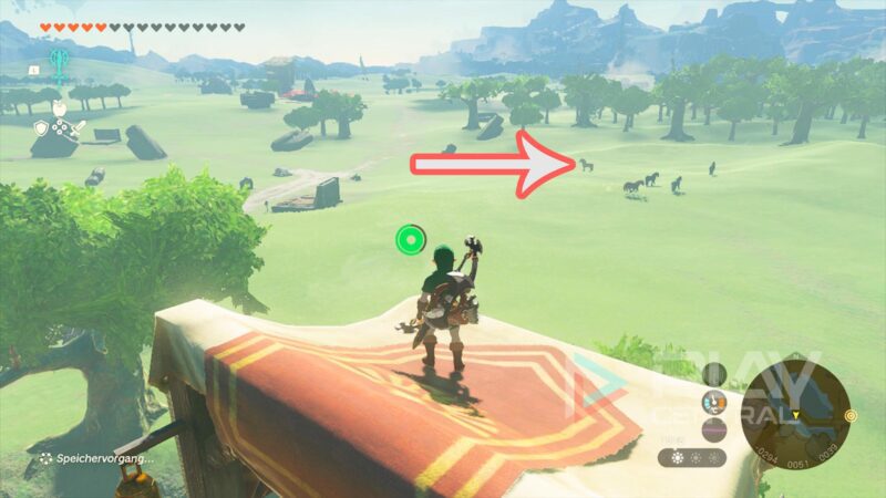 Das Pferd sitzt genau südlich vom Spähposten. Folgt dem Weg vom Spähposten aus mit dem Gleiter und nähert euch dem Pferd. Es steht neben einer kleinen Herde, bestehend aus drei bis vier Pferden (etwas abseits). Wenn ihr im Spähposten auf einen höhere Position klettert oder den Turm verwendet, seht ihr die Pferde im Süden grasen.